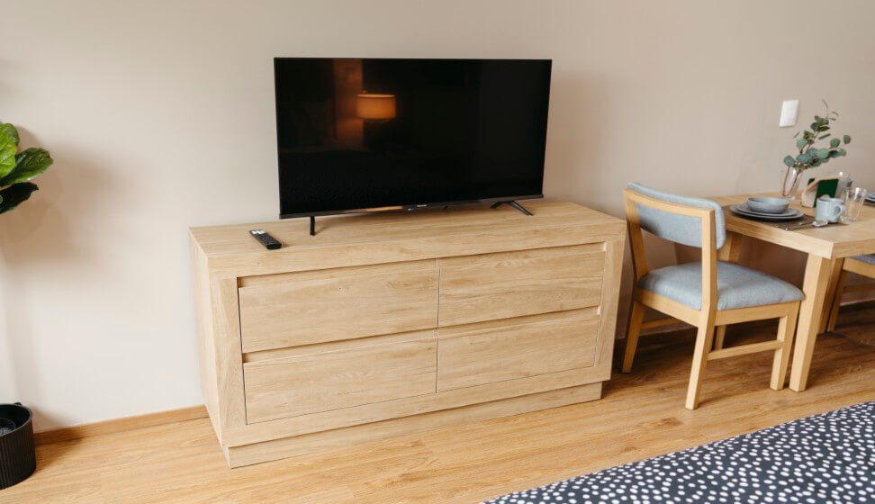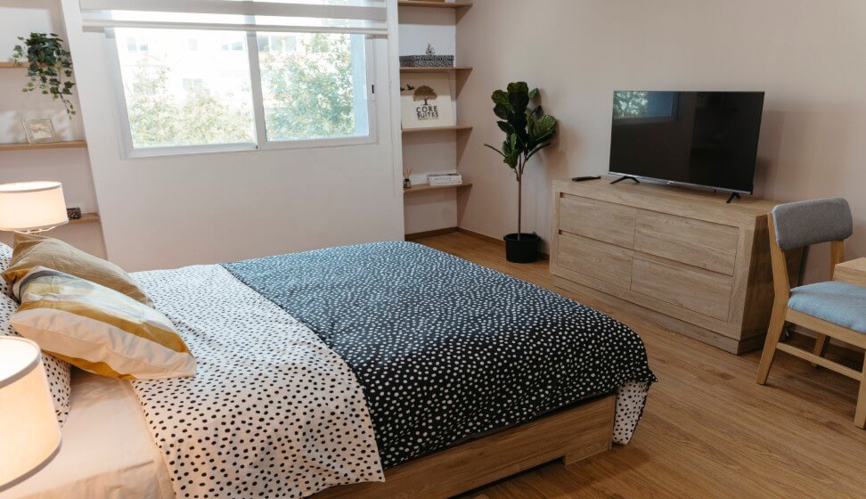 Nuestra Jr. suite está completamente amueblada, para tu comodidad te incluimos loza, ropa de cama, toallas, limpieza de habitación 2 veces por semana y lavado de blancos 1 vez a la semana.