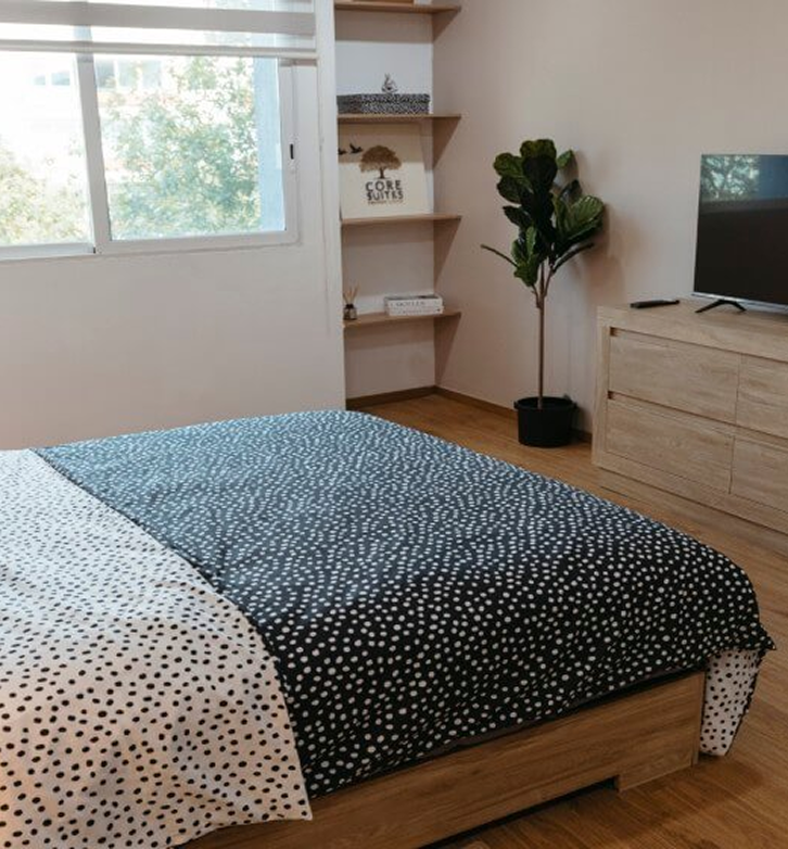 Vive en una suite completamente amueblada, para tu comodidad te incluimos loza, ropa de cama, toallas, limpieza de habitación 2 veces por semana y lavado de blancos 1 vez a la semana. Nuestra Jr. suite está completamente amueblada, para tu comodidad te incluimos loza, ropa de cama, toallas, limpieza de habitación 2 veces por semana y lavado de blancos 1 vez a la semana.